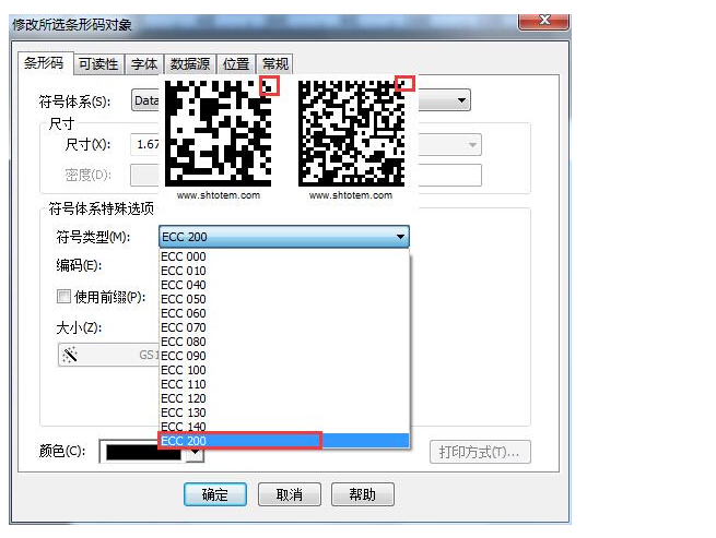 “符號類型”的問題Motorola的掃描槍只支持ECC200這種類型的Data Matrix如果用了別的,就無法掃描,如下圖中左側Data Matrix為ECC200,右側Data Matrix為ECC140,可以明顯看出條碼上ECC140在同樣大小的Data Matrix碼上面要比ECC200密,并且在條碼右上角ECC200的Data Matrix為空,ECC140是有黑塊,所以只要在編輯Data Matrix碼時把符號類型選擇為ECC200,這樣做出來的Data Matrix就可以被Motorola的二維條碼掃描器正常讀取。