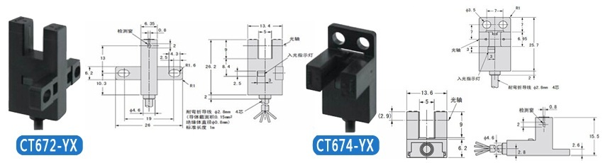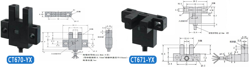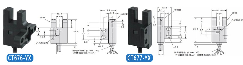 | KJT-CT671-YX 控制輸出 | 受光時紅色指示燈滅,NPN集電極無輸出;遮光時紅色指示燈亮,NPN集電極開路輸出DC5V--24V 、 100mA以下,殘留電壓0.5V以下(負荷電流100mA時)、殘留電壓0.3V以下(負荷電流40mA時) |