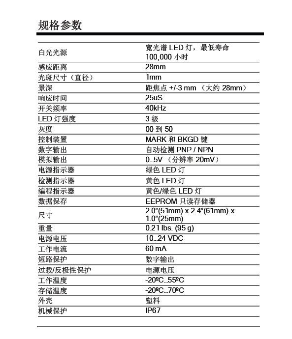 已調(diào)白光光源可聚焦為 2.5-3mm 光斑并直射目標(biāo)。返回到傳感器的漫射光會經(jīng)過測量。當(dāng)其級別等于或超過閾值時,數(shù)字輸出將改變狀態(tài)。由于傳感器能夠快速響應(yīng),因此它適用于高速應(yīng)用場合。傳感器提供數(shù)字輸出,可自動配置NPN 和 PNP。PLC 或計算機(jī)可用于監(jiān)控數(shù)字輸出信號的狀態(tài)。